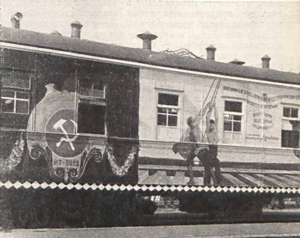 Первый поезд — имени тов. Ленина состоял из 15 вагонов, расписанных красочной агитационно-плакатной живописью, с яркими энергичными лозунгами. Его внешний вид сам по себе представляет яркий образец художественной подвижной агитации и пропаганды.