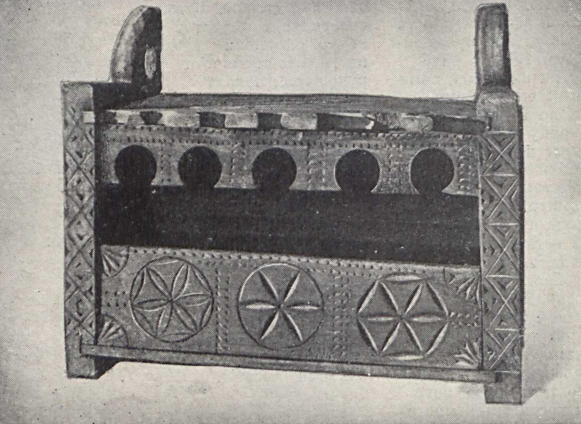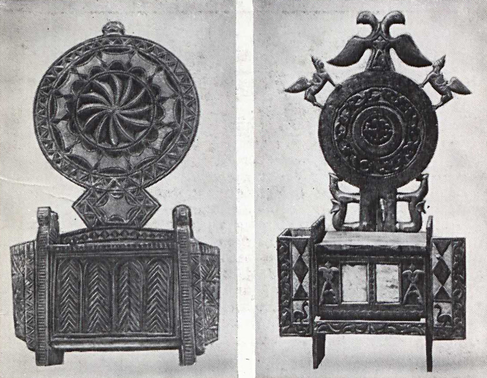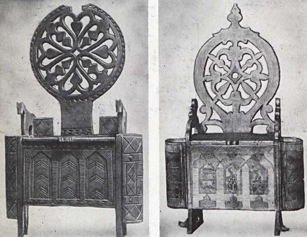 Наиболее насыщенными резьбой и трудоемкими для изготовления были поставцы второго типа — «креслообразные». Они встречаются в зоне среднего течения Каракой-су. Здесь также размеры поставца зависели от спинки.