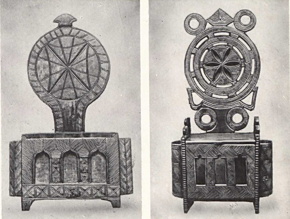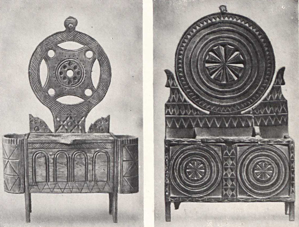 Для нас же наиболее существенным является яркая самобытная художественная форма поставцов-солонок, безусловно навеянная образами и предметами быта, окружавшими жизнь торца. Художественные формы дагестанских поставцов сохранили все богатство декоративных средств трехтысячелетней давности.
