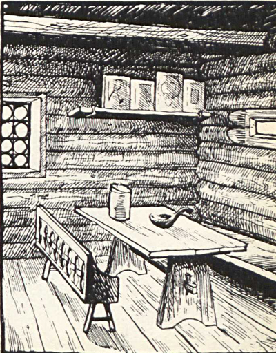 Сам интерьер жилой избы выглядел довольно просторным и свободным. Этому способствовал характер меблировки, тяготевшей к стенам, и печь, стягивавшая к себе мелкие домашние предметы.