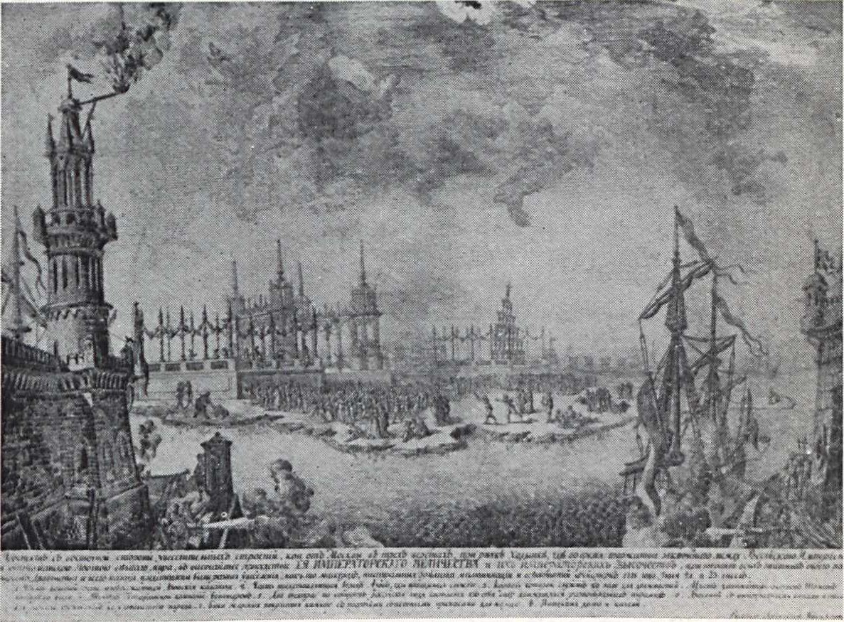 «Мелодрамма открылась наряднейшим императрицы въездом в Москву, предшествуемой и сопутствуемой блистательным двором, видными полками телохранителей и безчисленным народом. Торжественные врата, взгроможденные на скорую руку, хотя из лубков и рогож, но раскрашенные, раззолоченные и в приличных местах убранные соответственными предмету картинами, восхищали всех до безумия, к чему присоединяя военную музыку, колокольный звон и пушечную пальбу, каждый может себе вообразить, что сие очаровательное зрелище, не взирая на лютую зиму, было безподобно».