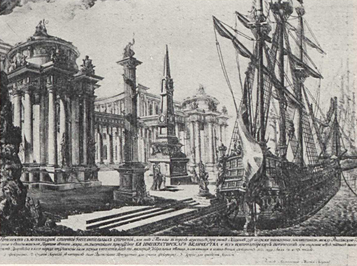 Итак, идея состояла в том, чтобы перенести торжества победы как бы на самую завоеванную территорию, дать зрителям и участникам возможность почувствовать себя победителями, пирующими в покоренных городах. И можно, пожалуй, поверить Екатерине, что она сама придумала этот прием, а не приписывать его Баженову, как это теперь принято.