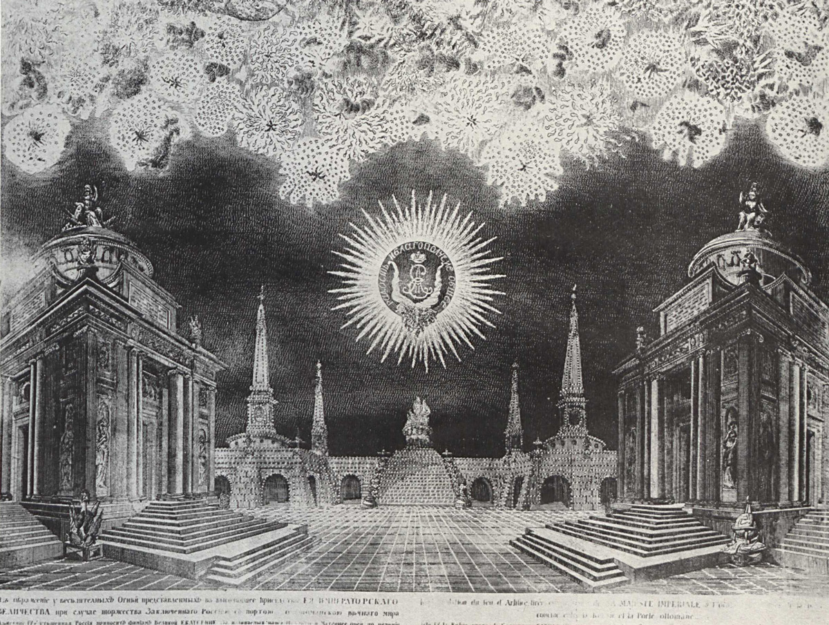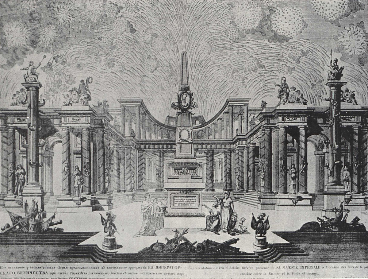 Празднования побед со времен Петра I отмечались торжественными въездами победителей в столицу сквозь пышно украшенные триумфальные арки; дома и улицы по вечерам иллюминировались; на улицах и площадях устраивались балаганы, игры и угощение для народа. Необходимой частью торжества был фейерверк.