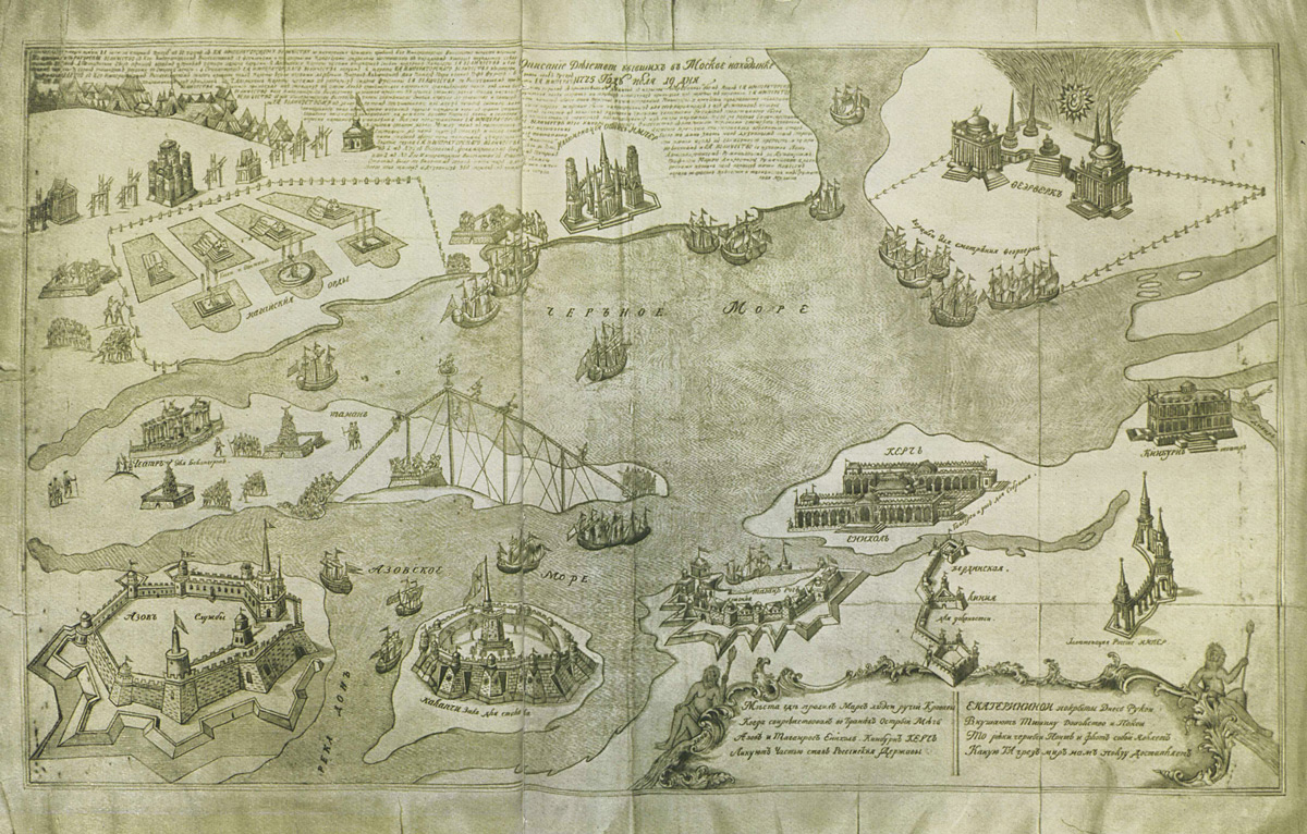 7 апреля 1775 года Екатерина писала известному энциклопедисту барону Гримму: «...Так как вы пишете о торжествах по случаю мира, то слушайте, что я вам расскажу, и не верьте ни в едином слове нелепостям, какие пишутся в газетах. Был составлен проект празднеств, и все одно и то же как всегда: храм Януса, да храм Бахуса, храм еще, не весть какого дьявола, все дурацкие, несносные аллегории, и притом в громадных размерах, с необычайным усилием произвести что-нибудь безсмысленное. Я разсердилась на все эти проекты и вот в одно прекрасное утро приказала позвать Баженова, моего архитектора, и сказала ему: «Любезный Баженов, за три версты от города есть луг; представьте, что этот луг Черное море, и что из города две дороги; ну вот одна из сих дорог будет Танаис, а другая Борисфен (Дон и Днепр. — М. Д.), на устье первого вы построите столовую и назовете Азовом; на устье второй — театр и назовете Кинбурном. Из песка сделаете Крымский полуостров, поместите тут Керчь и Еникале, которые будут служить бальными залами. Налево от Танаиса будет буфет с винами и угощением для народа; против Крыма устроится иллюминация, которая будет изображать радость обоих государств о заключении мира; по ту сторону Дуная пущен будет фейерверк, а на месте, имеющем изображать Черное море, будут разбросаны лодки, корабли, которые вы иллюминуете, по берегам рек, которые в то же время и дороги, будут расположены виды, мельницы, деревья, иллюминованные дома, и таким образом у вас выдет праздник без вычур, но, может статься, гораздо лучше многих других, и в нем будет гораздо больше простоты... Позабыла Вам сказать, что вправо от Танаиса Таганрог, где будет ярмарка. Вы привыкли все разбирать, но скажите, разве это дурно придумано? Правда, что море на твердой земле — безсмыслица, но не обращайте внимания на этот изъян, и все остальное окажется очень сносно. Так как место очень просторное, и будет это вечером, то все сойдет, по крайней мере нисколько не будет хуже, чем нелепые языческие храмы, которые мне страшно надоели».