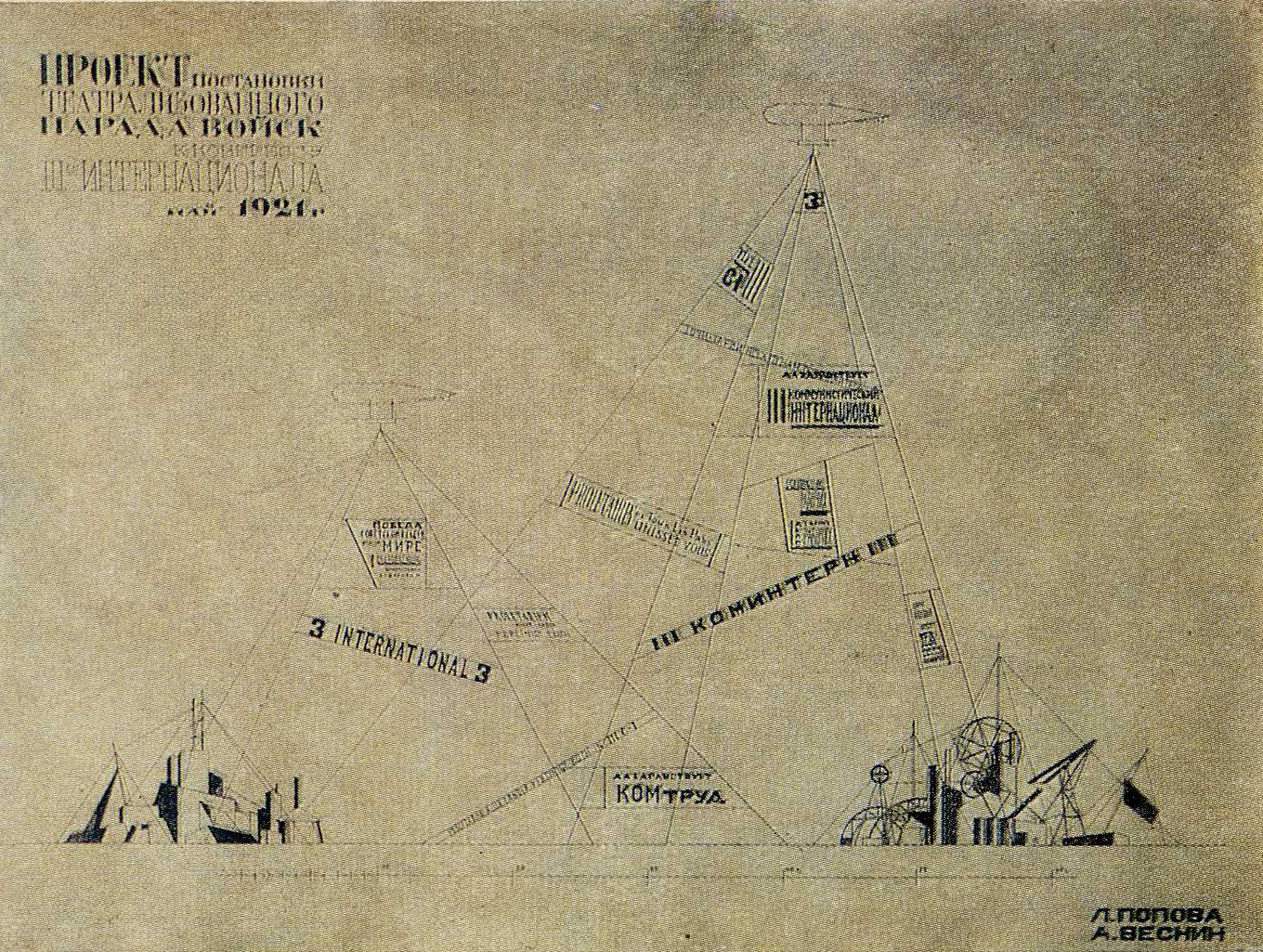 Первым опытом выведения театра за стены здания, непосредственного слияния театрального зрелища с действиями зрительской массы был разработанный Вс. Мейерхольдом с Л. Поповой и А. Весниным проект парада войск к III конгрессу Интернационала в мае 1921 года. На эскизе-чертеже Поповой запечатлены инженерно-архитектурные — построения агитационного оформления пространства Ходынского поля, на котором должен был развернуться театрализованный парад с участием сотен красноармейцев, рабочих, студентов...
