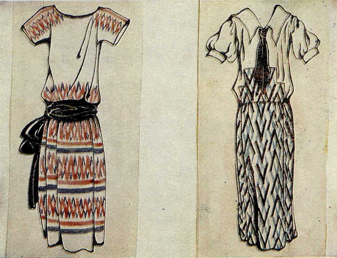 Среди ее рисунков мы видим сотни эскизов орнаментации тканей для 1-й Государственной ситценабивной фабрики; некоторые ее замыслы были осуществлены. Ее рукой выполнены модели женских платьев и ансамблей, которые следовало сшить из тканей с ее же рисунками, ею сделаны проекты рабочей одежды для театра.