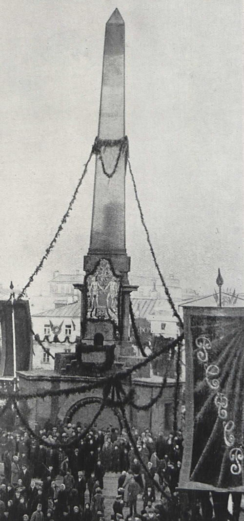 На строгом классическом «Обелиске Свободы» перед зданием Московского Совета Рабочих Депутатов, где впоследствии была воздвигнута скульптура Н. А. Андреева, в 1918 году висело панно неизвестного художника, изображающее обнаженные фигуры рабочего и крестьянина, окруженные затейливым орнаментом.
