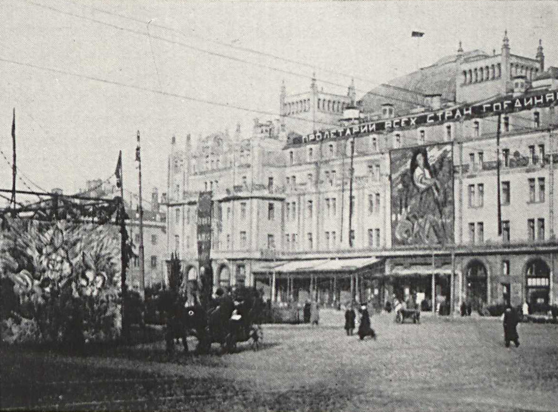 Более новаторски решил грандиозное панно «Пролетарии всех стран, соединяйтесь!» на здании «Метрополя» художник И. И. Захаров. В изображенной им гигантской фигуре рабочего с красным знаменем в руках чувствуется характерная для этого художника романтическая приподнятость, которая сообщает вполне конкретному образу черты революционной героики.