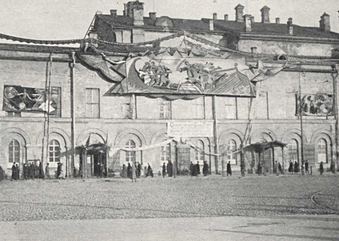Аналогичное явление мы видим и в праздничном оформлении Ленинграда в том же 1918 году (Н. Альтман, В. Лебедев). Но если в Ленинграде оно могло вызвать обоснованные возражения, так как шло в разрез с единым строго-величавым ансамблем города, то Москва, с ее пластической живописностью, являлась удачным фоном, на котором своеобразное праздничное убранство первой годовщины Октября обрело свою особую художественную жизнь.