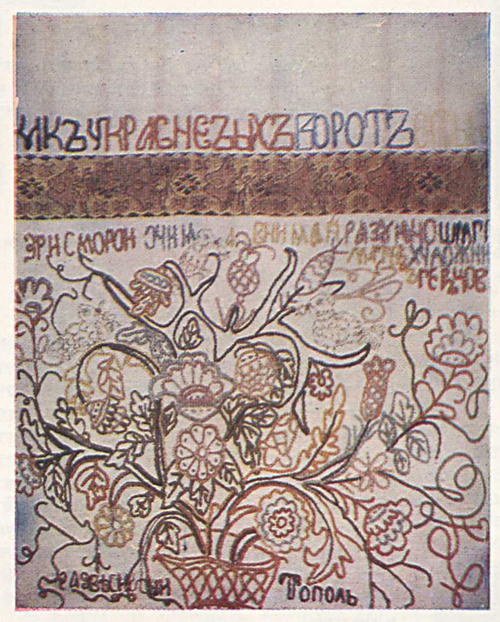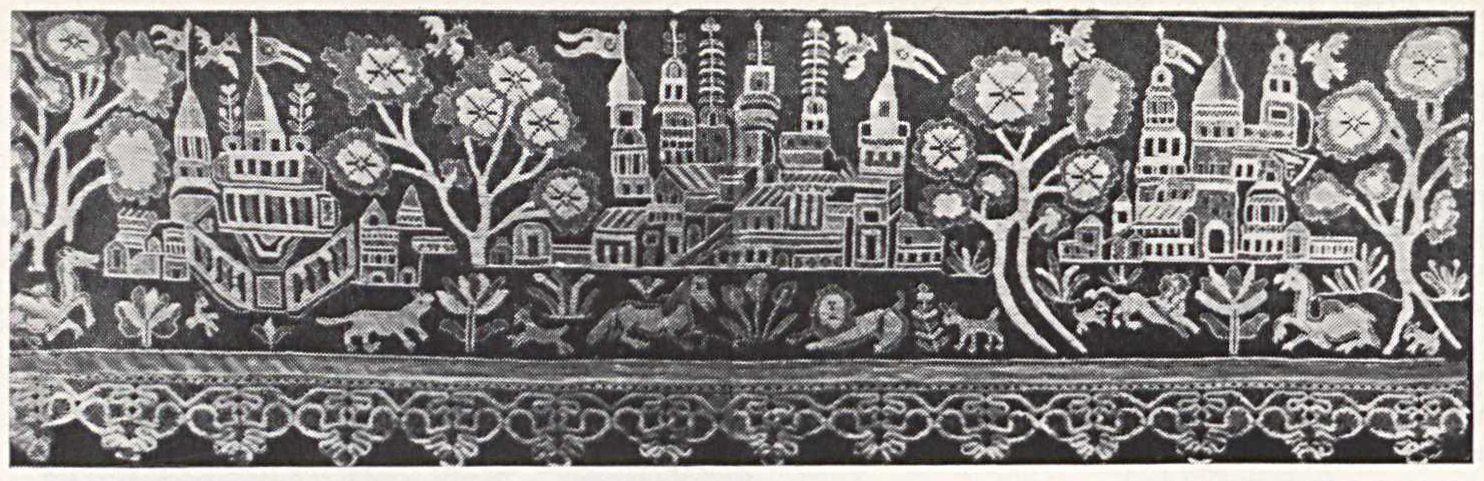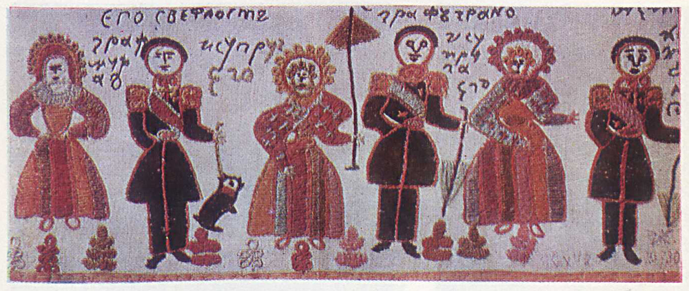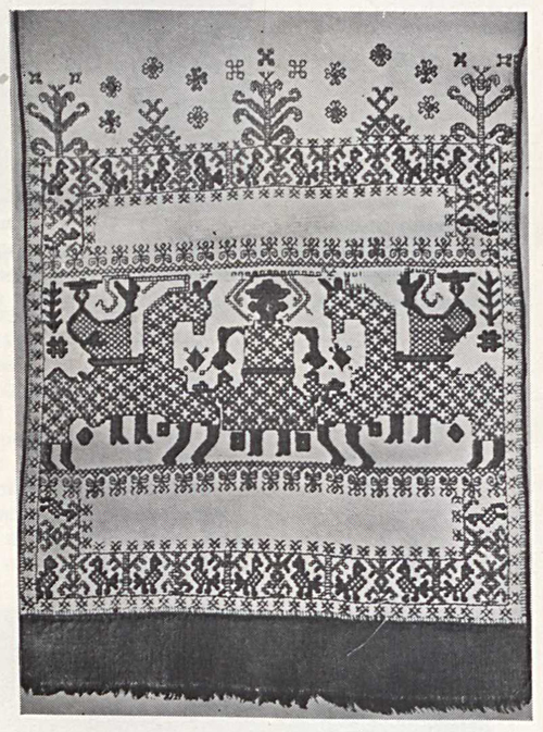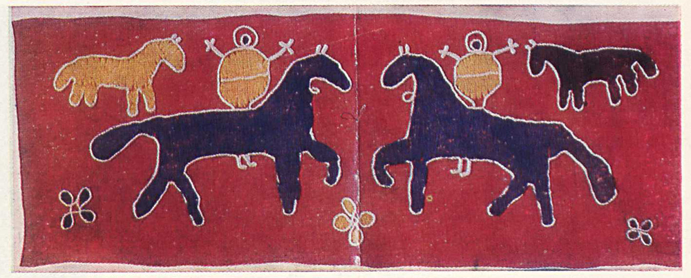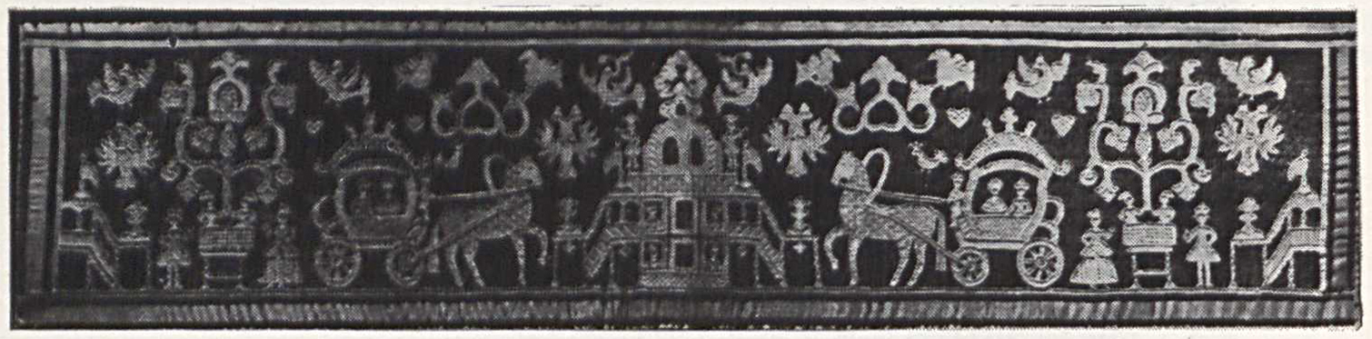 В наивных вышивках с аналогичными сюжетами этой эпичности нет. Старая семантика постепенно разрушается, поскольку новые веяния, иное мироощущение рождают и новое содержание, заставляют переосмыслять старые сюжеты. Традиционные образы конкретизировались, приобрели более реалистичные, с точки зрения жизненного правдоподобия, формы; появилась свободная живость, подвижность в расположении мотивов на ткани. Подобное восприятие действительности отразилось и в образно-содержательном переосмыслении старой иконографической схемы. Так, всадники, прежде застыло стоявшие перед деревом, теперь свободно едут по лугу с цветами, может быть, гонят коней в ночное...