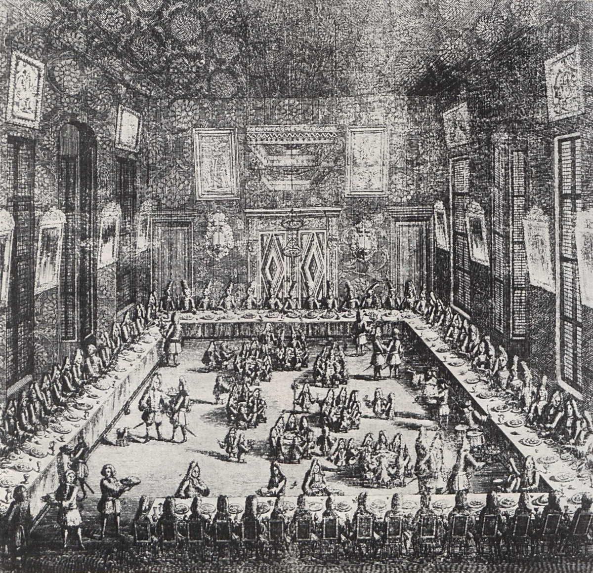 А. Зубов. Свадьба Петра и Екатерины в Меншиковском дворце в Петербурге. Гравюра на меди. 1714. Фрагмент