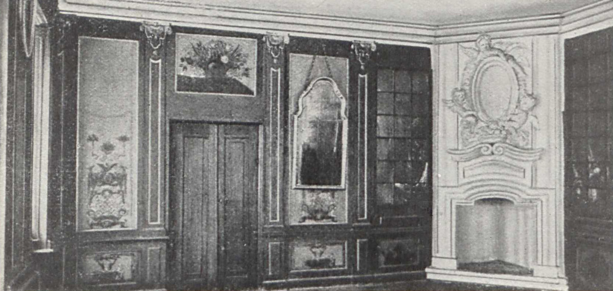 От этого убранства сохранилось немногое. Вместо мраморных полов настланы сравнительно новые деревянные. Китайских обоев тоже нет. Стены просто побелены по штукатурке. Одна из комнат сохранила старую обивку белым холстом и деревянной панелью. В неприкосновенности дошла до нас маленькая передняя с резной деревянной перегородкой, в центре которой изумительный по рисунку и пластике плоский рельеф — изображение Минервы. Этот шедевр деревянной резьбы выполнен Николя Пино, и его формы были продиктованы узким пространством передней, не позволявшей деревянную перегородку украсить высоким рельефом или поставить здесь круглую скульптуру. Но при этом мастер сохранил богатство светотеней и пластическую точность фигуры. Это очень красивое произведение вводит посетителя в характер интерьера, где дерево как декоративный материал используется очень широко. От петровского времени дошли до нас гладкие наборной работы чудесные двери с бронзовыми шпингалетами и такими же замками в виде плоских коробочек. Судя по спальне Петра, некоторые комнаты были отделаны понизу деревянными панелями, другие — не сохранившимися сейчас голландскими изразцами с нарисованными синей краской кораблями, архитектурными пейзажами, жанровыми сценами.