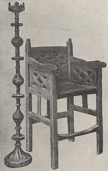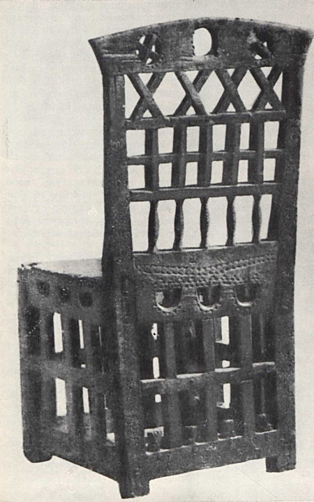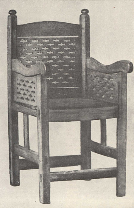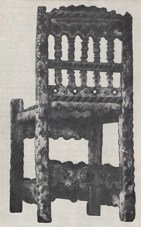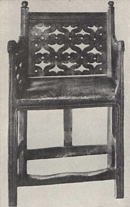 На другой репродукции также представлено седалище, предназначенное для центрального местоположения в интерьере. Его форма и декоративные детали теснейшим образом связаны с романским мебельным искусством европейского средневековья XII — XIII веков. Об этом свидетельствует членение всех сторон основания стула с помощью проножек не только по горизонтали, но и посредством прямоугольных брусков по вертикали. Подобные детали, имеющие конструктивное и декоративное значение, встречаются на старинных образцах мебели как в странах южной и центральной Европы, так и на её северных окраинах —в Швеции и Норвегии. Они получили распространение и в мебельном искусстве Древней Руси, сохранившись в XVI и XVII столетиях. Узор решетчатой спинки этого стула состоит из тонких прямоугольных планок, образующих простейшие геометрические фигуры. Точеные балясины составляют его нижний фриз. Задняя и боковая стороны рамы сидения украшены небольшими полукруглыми прорезями, обрамленными узкой полосой выемчатой резьбы в виде треугольников. Подобные несложные украшения с резным обрамлением и без него можно видеть на резном фризе церковной скамьи XII— XIII веков (Испания) и на миниатюрах Лицевого Летописного свода второй половины XVI века. Кроме того, на задней стороне стула имеются декоративные детали в виде стержня с треугольным навершием. В прямоугольных просветах на нижней проножке они укреплены навершием вверх, а в полукруглых вырезах рамы сидения напоминают висящие кисти. Эта простая деталь, грубо вырезанная, а возможно, и тесанная топором, очень выразительна; можно предположить, что при ее изготовлении использован один из древнейших несложных приемов обработки дерева, применявшийся в мебельном мастерстве.