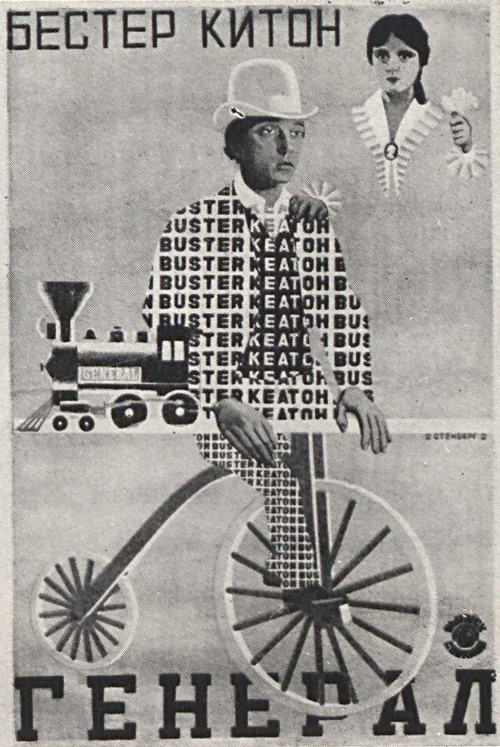 Находкой художников в этом плакате является чередование надписей с именем актера, они образуют костюм Бастера Китона и, напоминая надписи, бегущие по экрану, вносят динамику в неподвижный плакат.