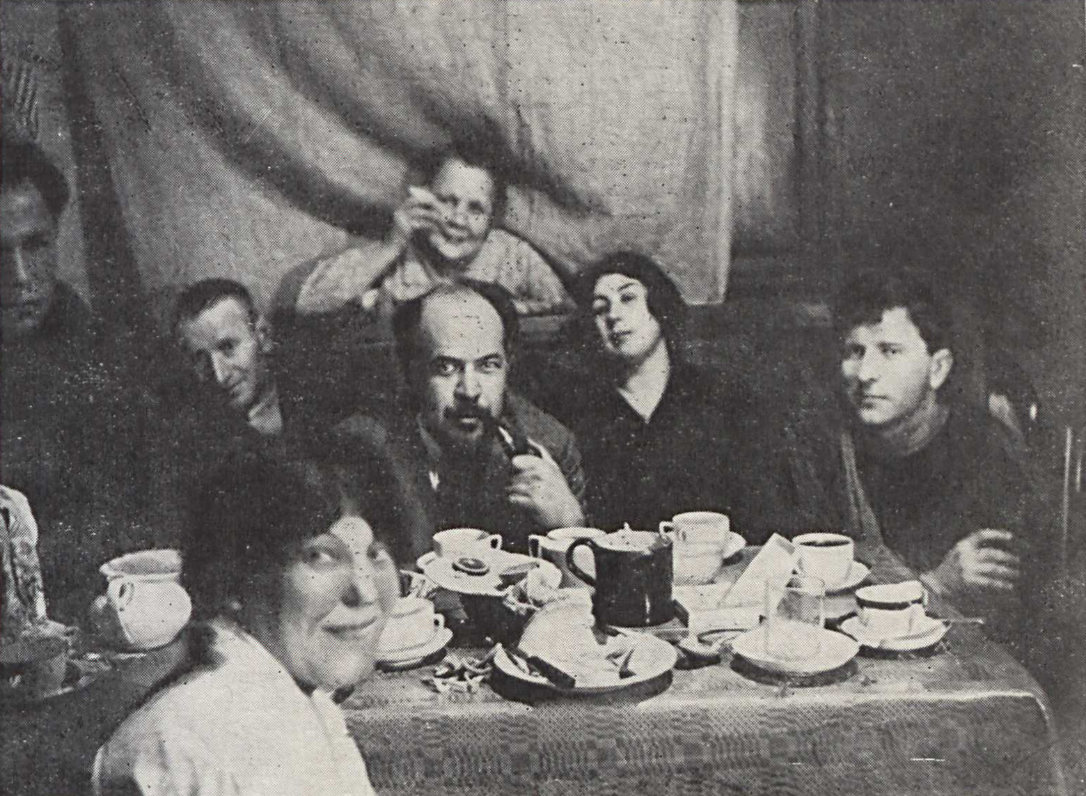 Слева направо: З.Н. Быков, А.М. Лавинский, О.Е Родченко (мать А. Родченко), А.А. Веснин, Л.С. Попова, Н. Соболев. На первом плане — В.Ф. Степанова. Фото А. Родченко. 1924 г.