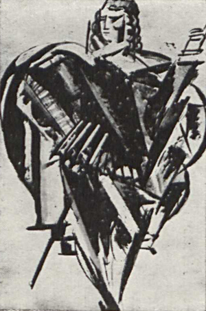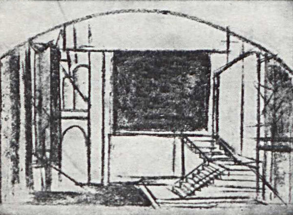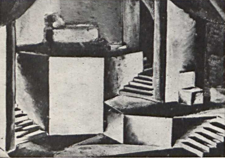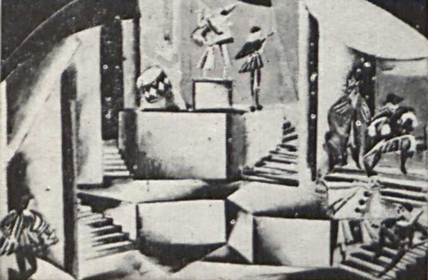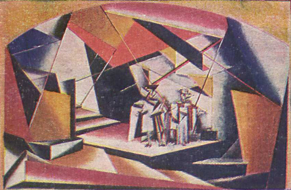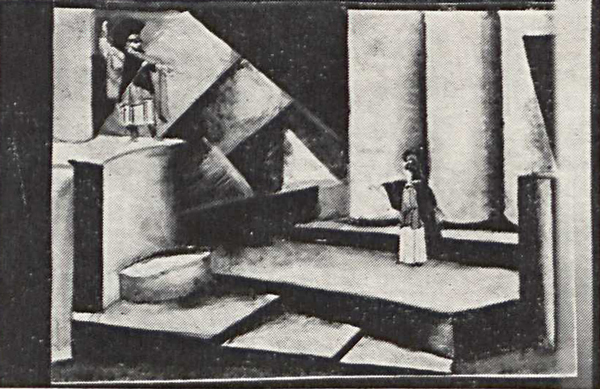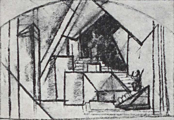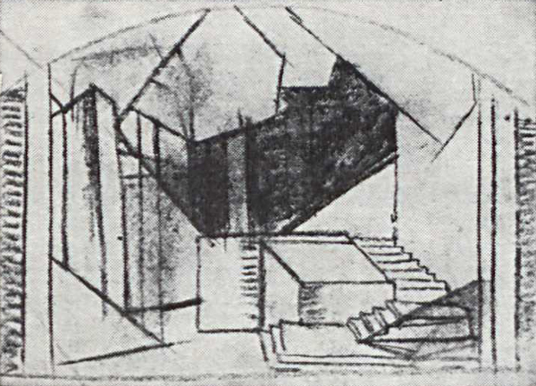 Есть эскизы декорации с обилием диагональных линий, плоскостей и форм, напоминающие живописные композиции А. Веснина тех лет. Но архитектор все же «прорвался» в Веснине сквозь отвлеченные композиции художника, и в окончательных эскизах он пошел по пути упрощения форм реальной архитектуры. Все сразу стало на свое место. Это была уже не просто живописная кубистическая декорация, а предельно упрощенная по формам архитектура.