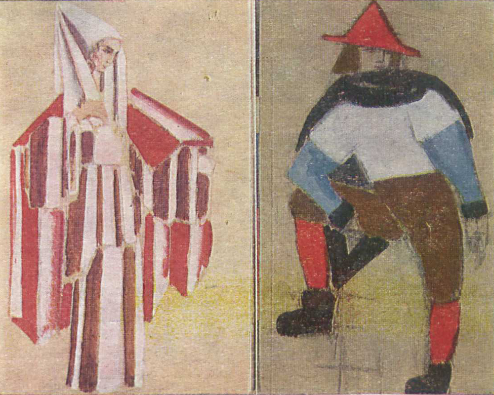 Среди многочисленных эскизов костюмов есть трактованные натуралистически и окончательные — кубистические, причем в них сохранена характеристика костюма персонажа, найденная в первом («натуралистическом») варианте. Даже позы фигуры на обоих вариантах эскиза одни и те же — только в первом случае на персонаже обычная одежда, а во втором — эта же одежда превращена в некий геометрический футляр — например, рукава в виде четырехгранных призм и т. д.