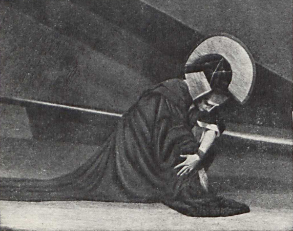 Коонен считает «оформление «Благовещения»... одним из самых впечатляющих в первый период истории Камерного театра. Оно замечательно передавало тяжеловесный фон трагедии —каменистая земля, тяжелый крестьянский труд, суровая опека церкви. Эту последнюю тему подчеркивали огромные деревянные статуи святых, обрамлявшие портал».