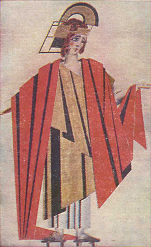 Такая же история произошла с костюмами «Федры». Мягкую шляпу старика или завязанный женский головной платок А. Веснин превращал в сложные объемно-пространственные композиции, состоявшие из геометрических плоскостей; предельно геометризуются и грим актеров, и одежда. Однако и во внешнем облике актера был осуществлен промежуточный вариант, хотя костюмы «Федры» были ближе к предельно геометризованному варианту.