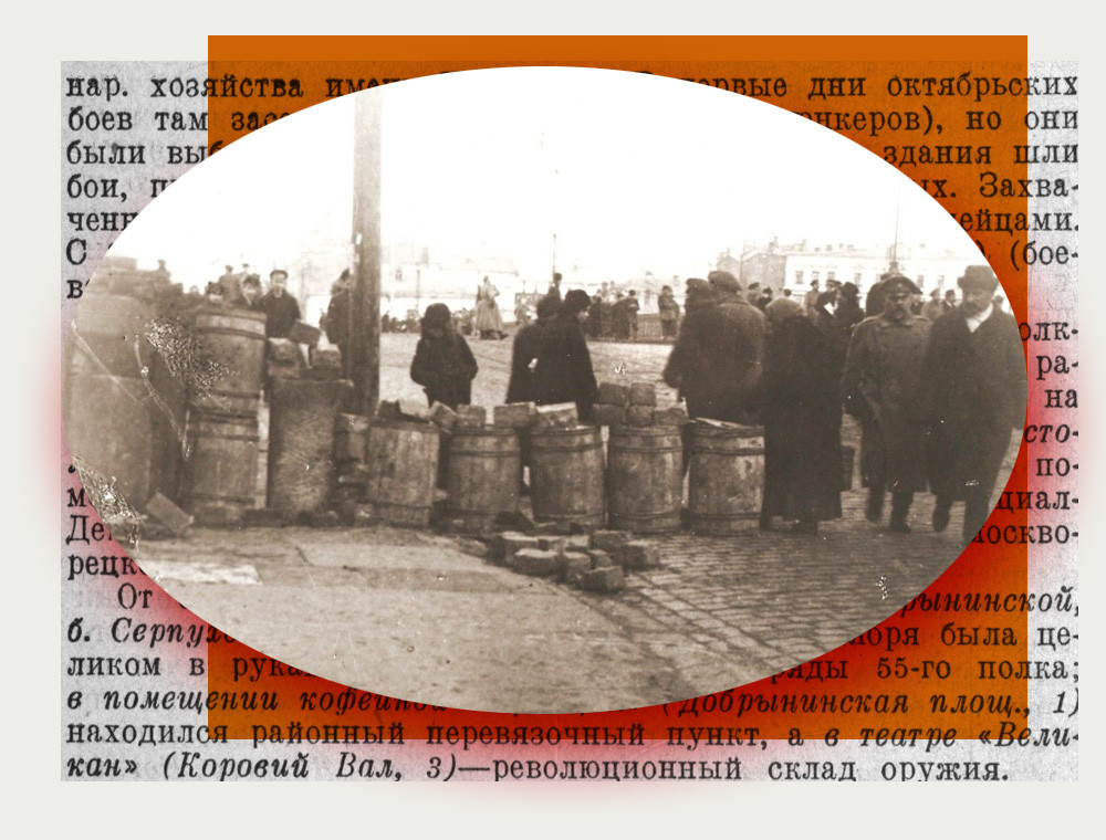Серпуховская площадь с 27 октября была целиком в руках красных — там стояли отряды 55-го полка; в помещении кофейной «Франция» (Серпуховская пл., 1) находился районный перевязочный пункт, а в театре «Великан» (ул. Коровий Вал, 3) — революционный склад оружия.