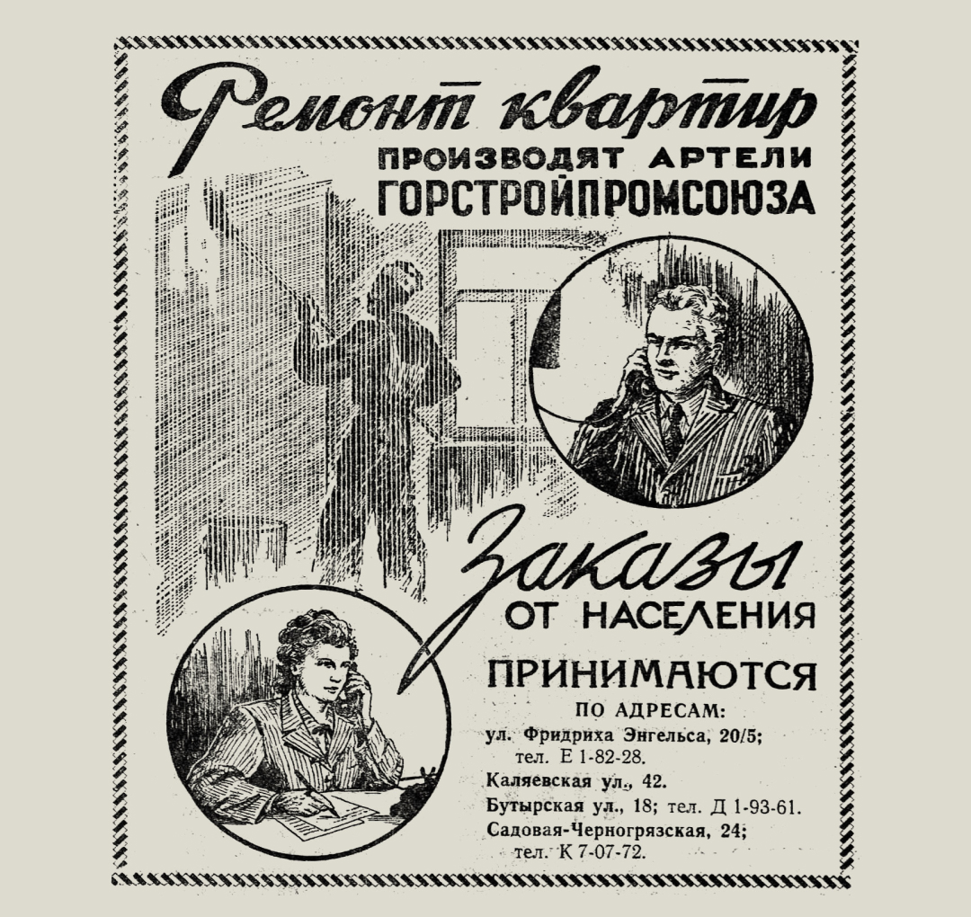 […] Исполком Моссовета предложил отделу местной промышленности, управлениям промышленности стройматериалов и жилищного строительства организовать на своих предприятиях дополнительное производство туалетных шкафчиков с зеркалами, керамиковых мыльниц, кухонных столов с гладильными досками, рамок для сушки белья, табуретов с ящиками для хранения белья, столов-шкафов, подвесных шкафчиков и т.п.