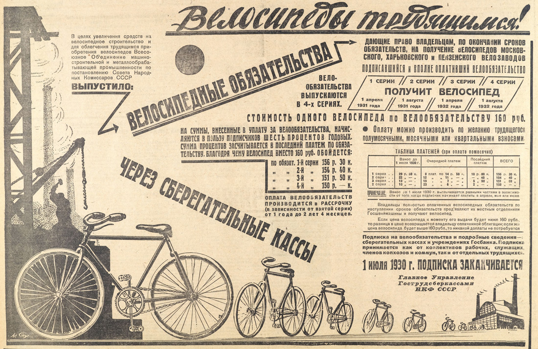 «Велосипеды трудящимся!» — объявление с таким лозунгом могли прочитать советские граждане в прессе весной 1930 года. Так стартовала общесоюзная подписка на велообязательства — гражданам предлагалось внести 160 рублей в сберкассу, взамен государство обещало в течение нескольких лет снабдить население самым доступным и демократичным транспортом — велосипедами.