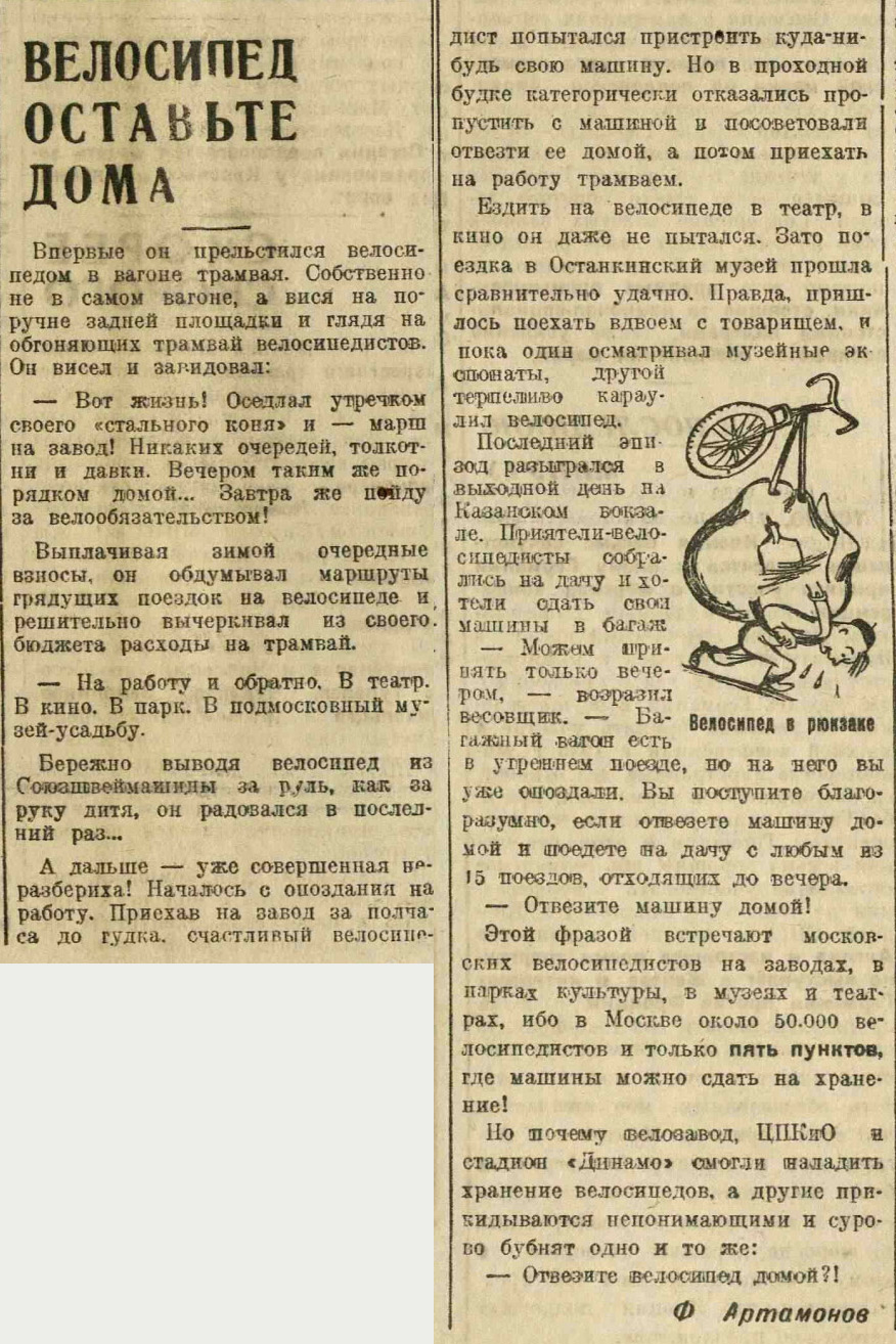 Этой фразой встречают московских велосипедистов на заводах, в парках культуры, в музеях и театрах, ибо в Москве около 50000 велосипедистов и только пять пунктов, где машины можно сдать на хранение!»